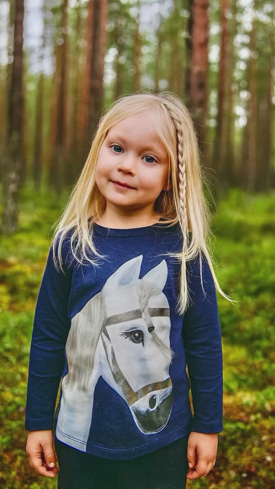Marineblaues Shirt mit besonderem Pferdemotiv für Ihre kleine/n Pferdeliebhaber/in.