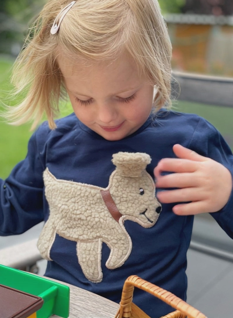 Dieses wunderschöne weiße Langarm-Shirt ist ein Lieblingsshirt vieler Kinder. Unser Hund Bobby ist aus Teddyfell appliziert und trägt ein braunes Halsband. Im Schlappohr hat er sogar eine Geheimtasche für Taschengeld oder kleine Schätze, die Ihr Kind auf dem Spaziergang findet.